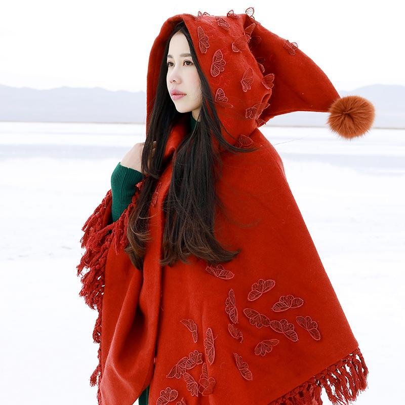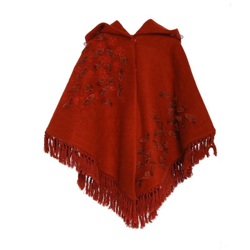 Be stunning and bold in our Belle Red Rose Embroidered Hooded Cape. You are sure to dazzle and stand out from the rest in this statement piece. The butterfly ornamentations and fringe adornments are a feminine addition to this cape. The large hood makes this a perfect piece for winter as it is sure to keep you warm and cozy. Use it as a cloak and wrap it around you for an immediate fashion statement. Pair it with solid prints and neutral colors and allow it to shine on its own.