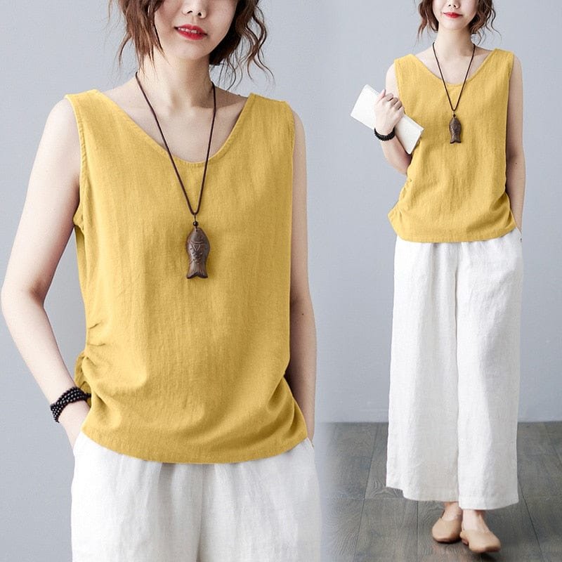 Looking for a top to keep you cool and comfortable on hot summer days? Check out the Mimi Cotton Linen V-neck Tank Top from Buddhatrends. This loose and comfortable top is made from a lightweight linen blend fabric and is available in four colors. It features a subtle round v-neckline. making it perfect to pair with solid linen pants or shorts. Add a neutral bracelet and hat to complete the look.