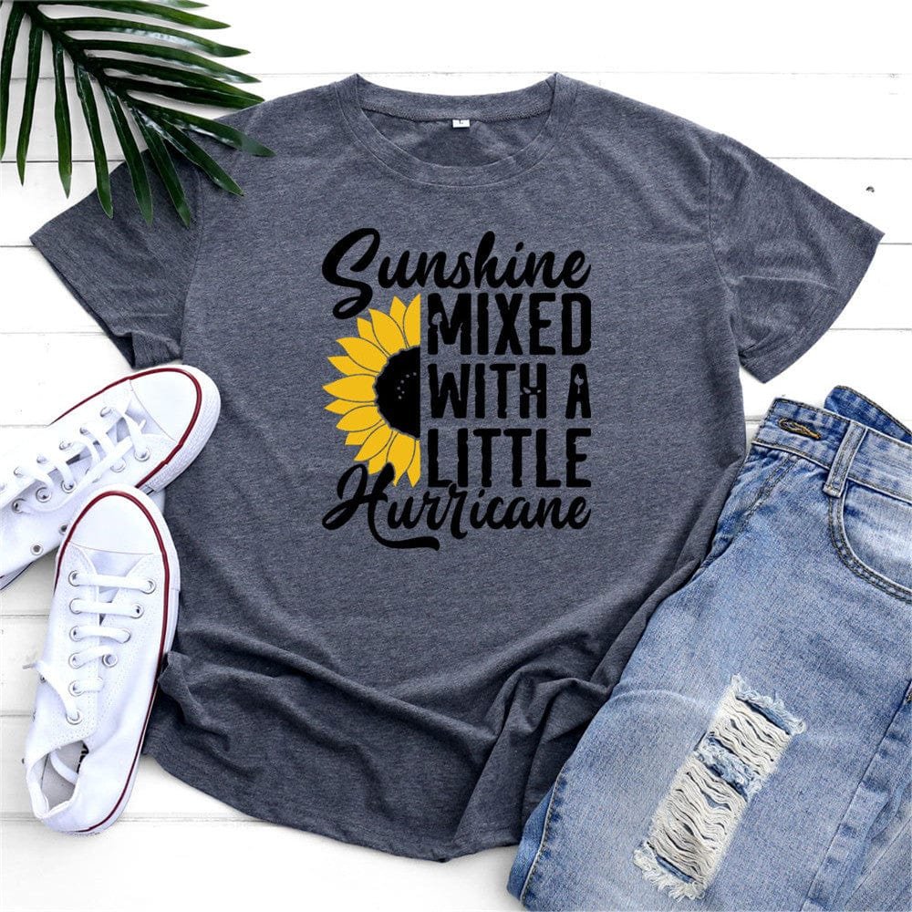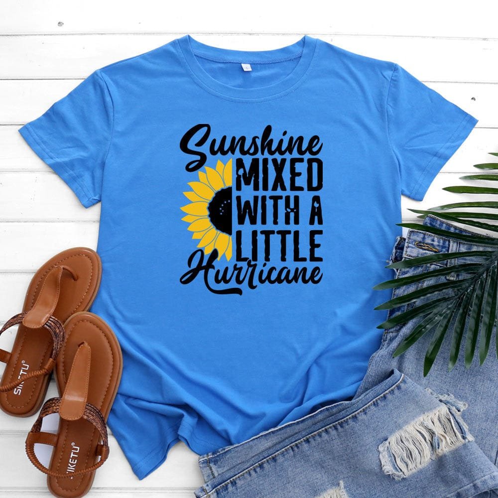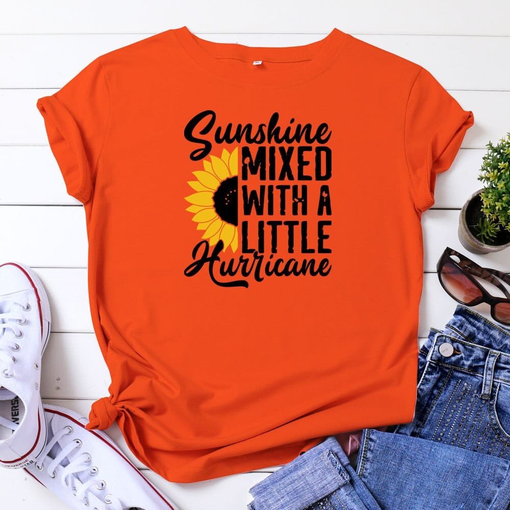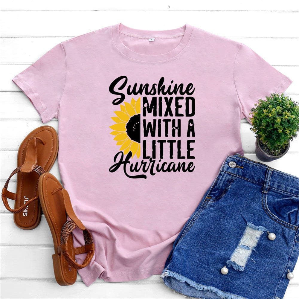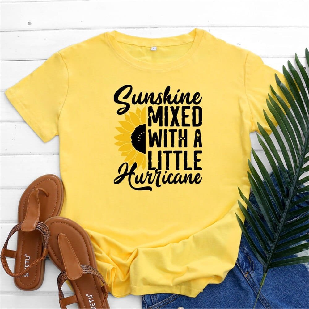 We believe that every day should be an adventure! Made of 100% cotton.theSunshine & Hurricane Graphic Cotton T-shirts are perfect for casual days spent exploring the great outdoors. Available in multiple colors and sizes.this teefeatures a half sunflower design with the quote โ€œsunshine mixed with a little hurricaneโ€ print. Whether youโ€™re scaling a mountain or just taking a walk in the park. this t-shirt will help you make the most of every moment.