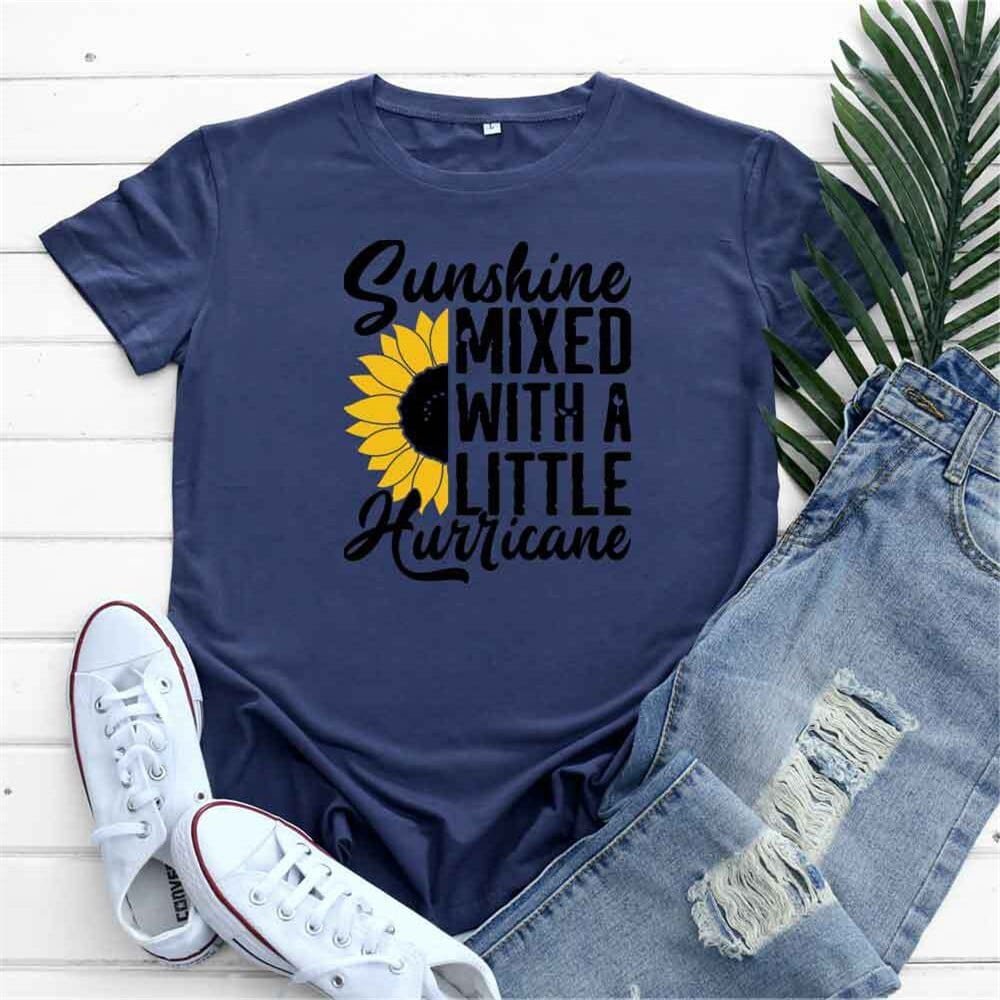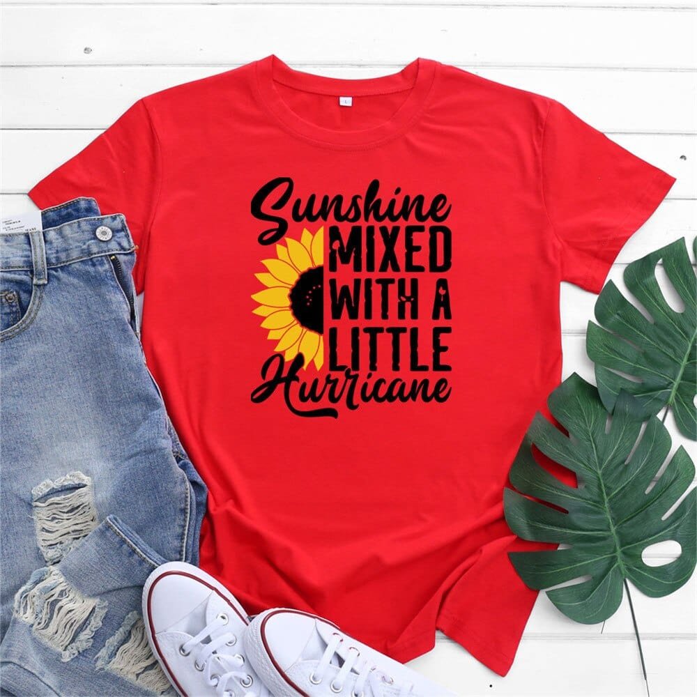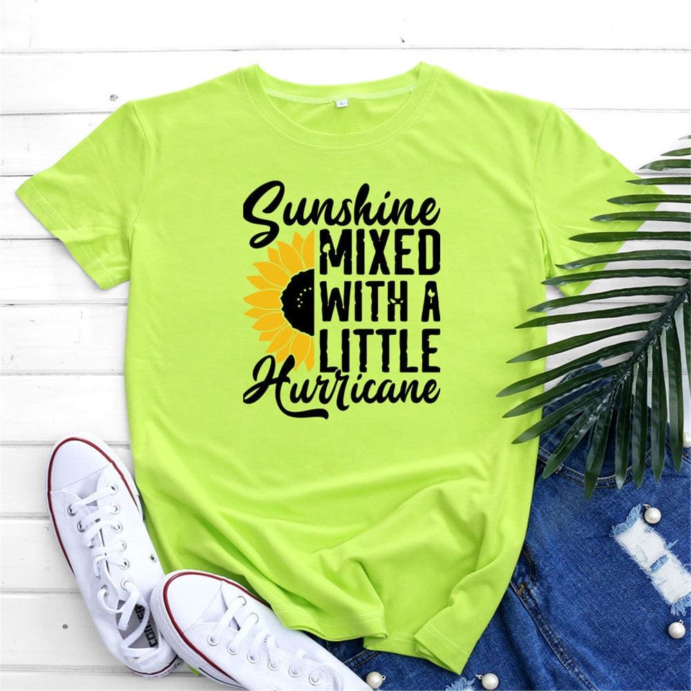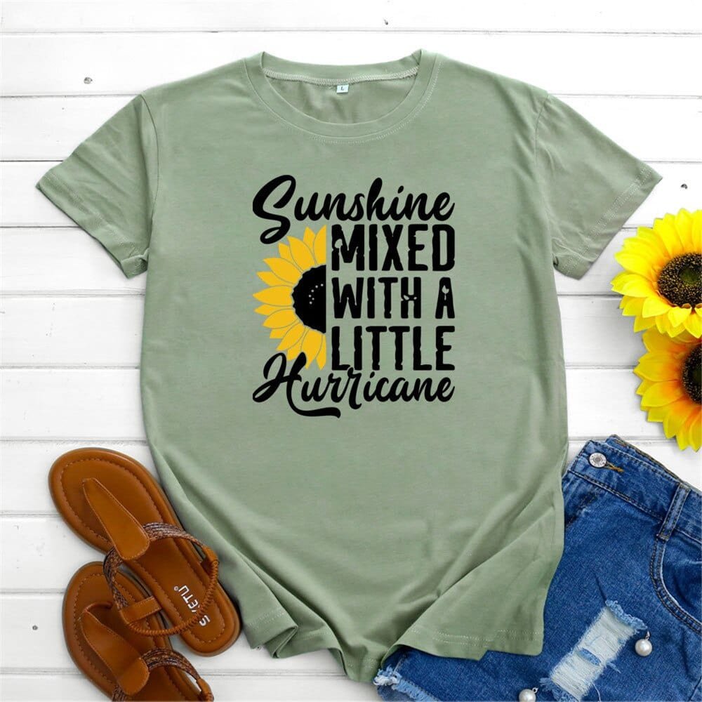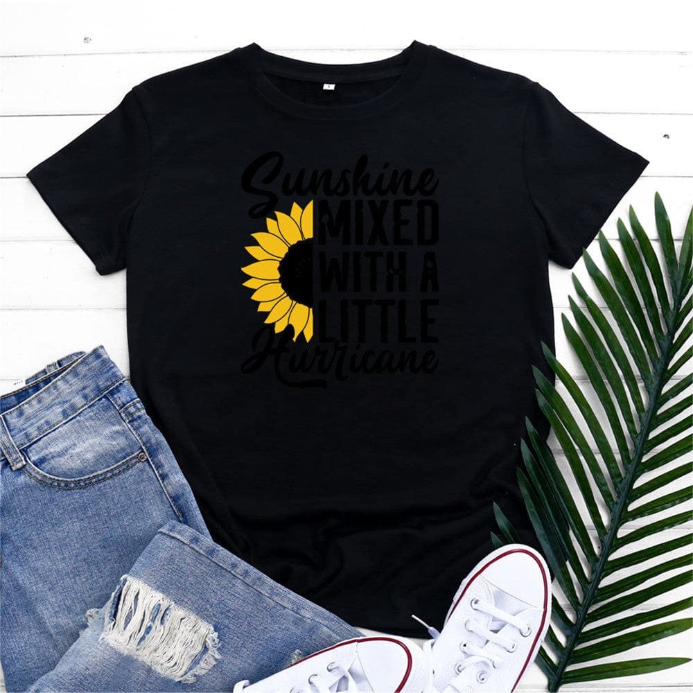We believe that every day should be an adventure! Made of 100% cotton.theSunshine & Hurricane Graphic Cotton T-shirts are perfect for casual days spent exploring the great outdoors. Available in multiple colors and sizes.this teefeatures a half sunflower design with the quote โ€œsunshine mixed with a little hurricaneโ€ print. Whether youโ€™re scaling a mountain or just taking a walk in the park. this t-shirt will help you make the most of every moment.