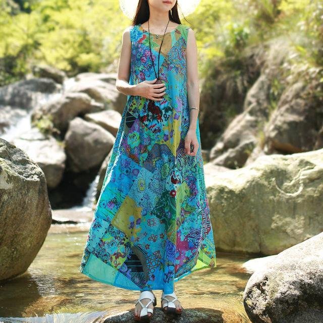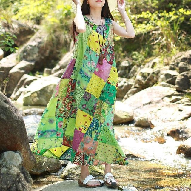 ThisSweet Dreams Random Patchwork Hippie Dress is adorned in a pretty floral print on a romantic versatile base hue. It has a sleeveless cut and a maxi length skirt with cotton material to keep its silhouette a little loose and relaxed. Wear with flat sliders on holiday or with heels for a glam evening look.